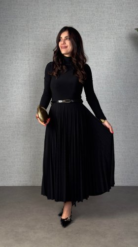 Kadın uzun kollu balıkçı yaka kemersiz pileli uzun sandy elbise